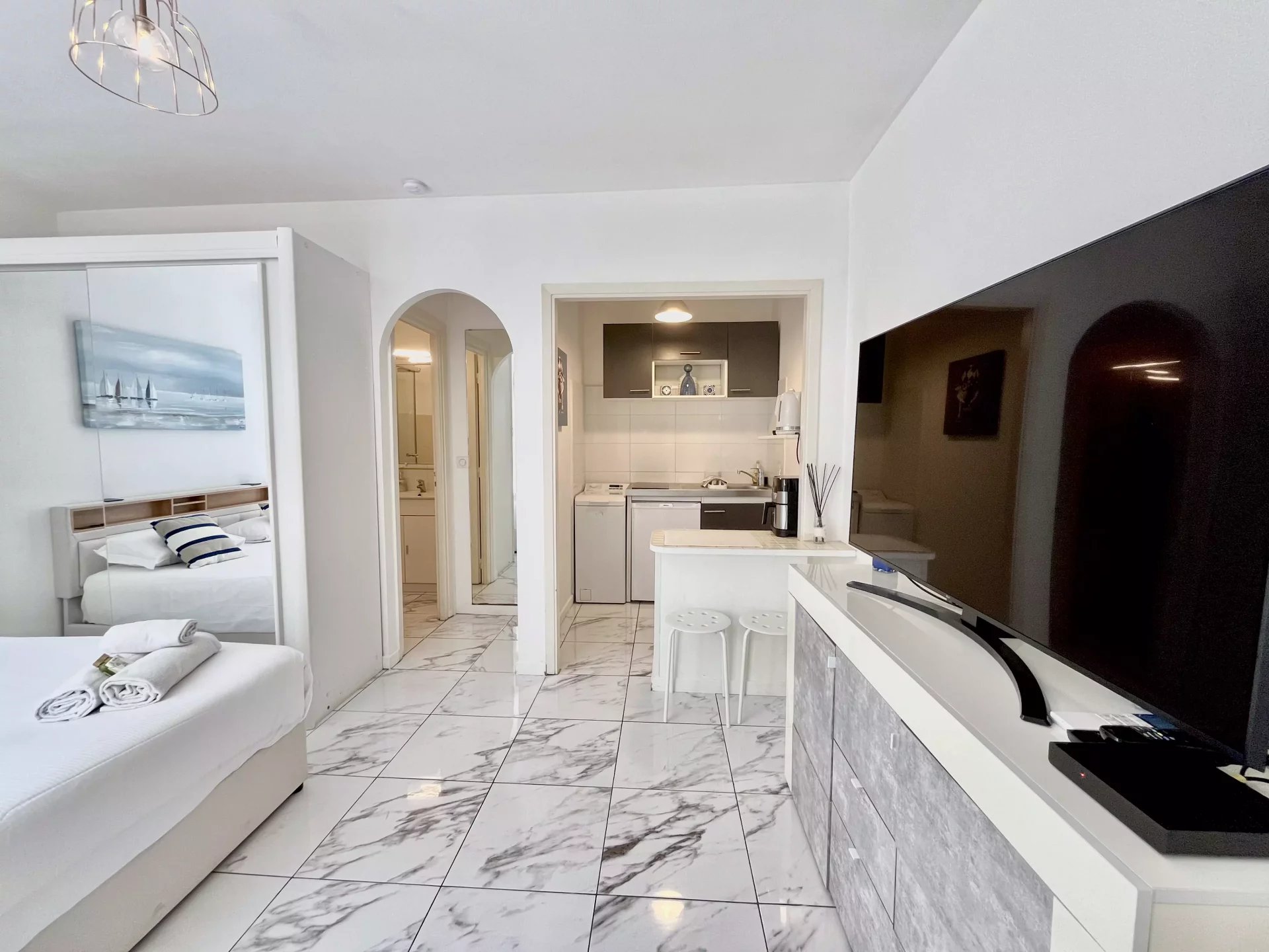 Charmant studio au calme idéalement situé au cœur de Cannes et du Carré d'Or, à seulement quelques pas de la Croisette. Joliment décoré, ce bien offre un espace de vie moderne avec cuisine ouverte . Parfait pour un pied-à-terre ou un investissement locatif, il bénéficie d’un emplacement privilégié, proche des plages et des commerces.